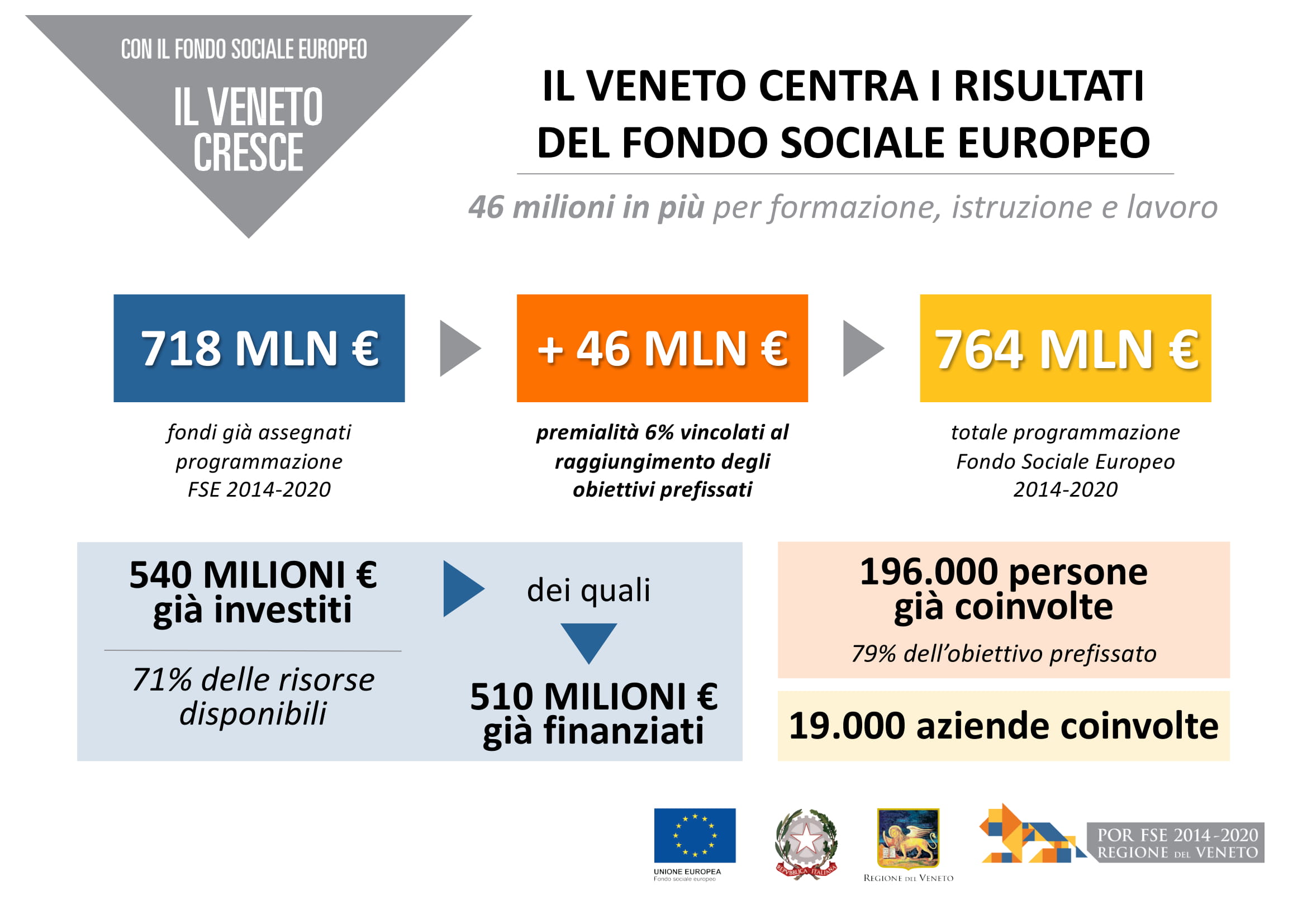 Grazie al raggiungimento degli obiettivi prefissati dall’Unione europea, la Regione Veneto avrà a disposizione ulteriori 46 milioni di euro da investire nella crescita occupazionale, nel rafforzamento della competitività del sistema economico regionale e nella prevenzione dell’esclusione sociale. Il premio arriva a seguito dei risultati ottenuti nella gestione del Fondo sociale europeo e consiste nello sblocco dell’intera dotazione di risorse prevista per la programmazione 2014-2020, andandosi ad aggiungere ai 718 milioni di euro già stanziati.