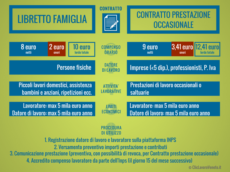 Maggiori dettagli sul Libretto Famiglia e sul Contratto di prestazione occasionale sono disponibili alle pagine dedicate del sito dell’Inps, www.inps.it.